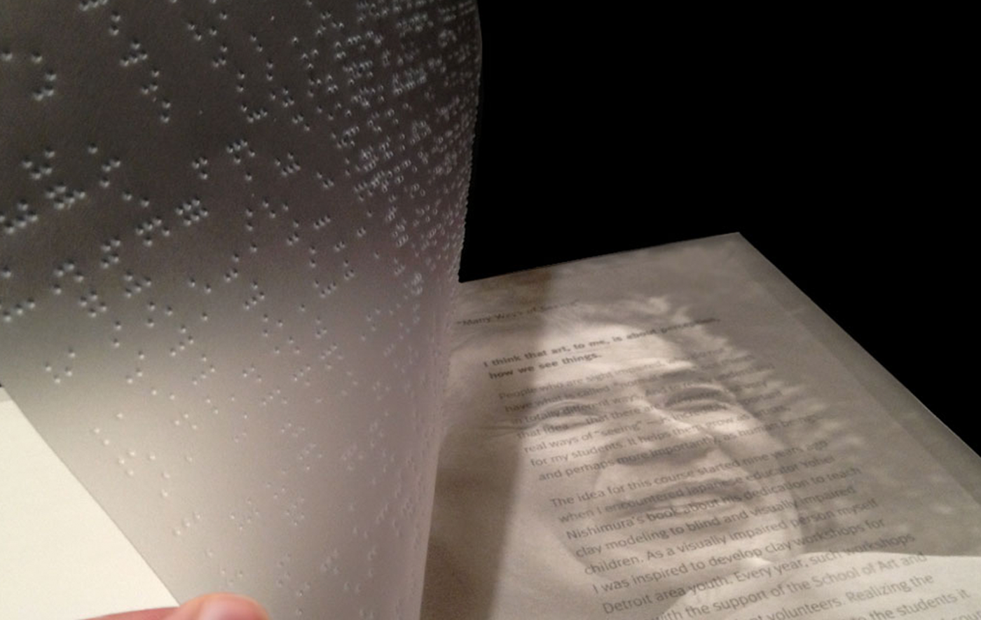 Design and Production of a 100+ page book featuring custom braille pages alongside full color photography of the artworks. Completed via a collaboration between the University of Michigan, the Ann Arbor Public Library, and the Washtenaw County Library for the Blind & Disabled.