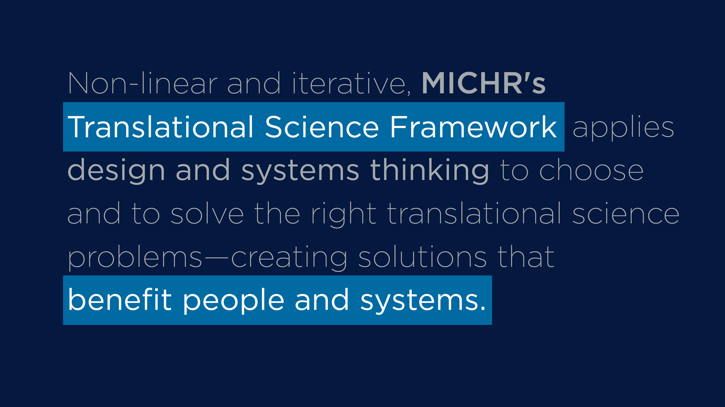 Roadblocks in the Translational Science (TS) pipeline are complex, abundant and embedded in systems of interrelated processes and people. MICHR applies a systematic and practical process to inform optimal TS investments and efficient realization of solutions.